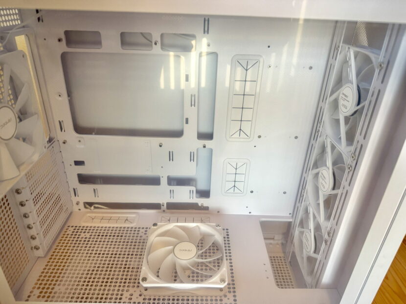 サイドパネルから中を覗いてみると、前面にファン3つ、背面に1つ、そして珍しく底面にもファンがついています。