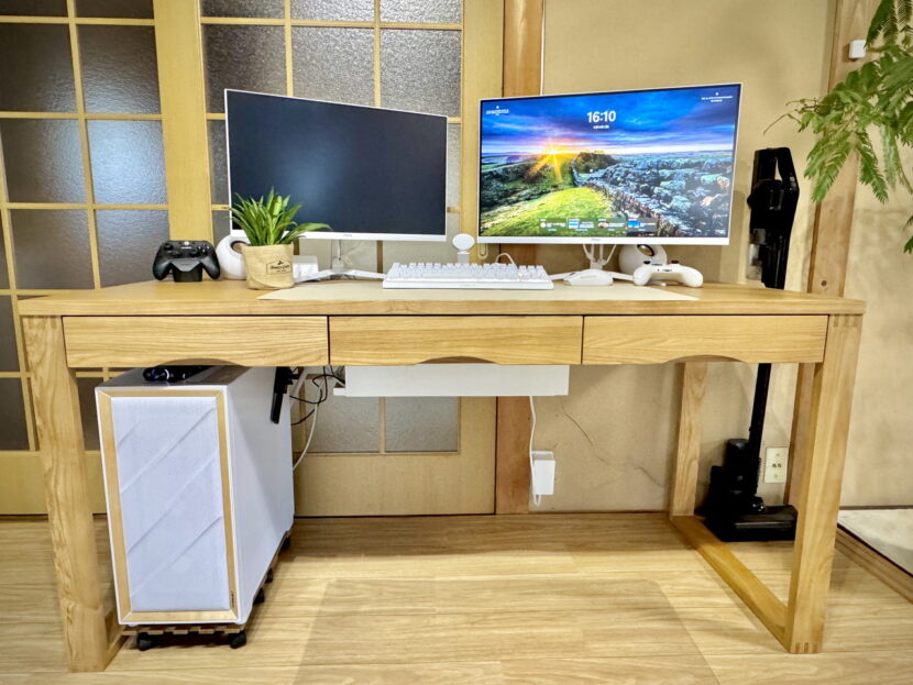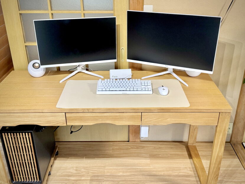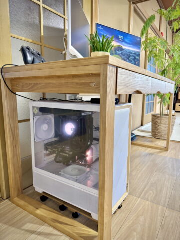 白い筐体と木の枠が木製デスクに合っていていい感じ。