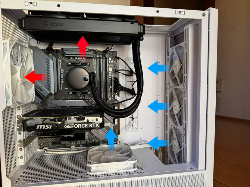 ハイエンドなグラフィックボードだと長くてケース内が分断されてしまうので下から空気を送るのは効果的かもしれません。