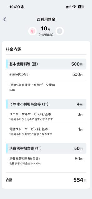 毎月の料金はirumoの税込550円にサービス料が追加されて554円。