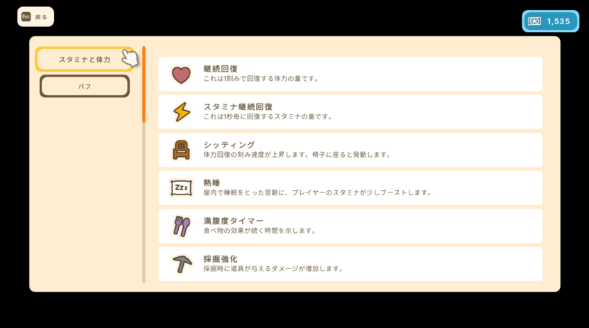Dinkumの体力やスタミナ回復のシステムやバフ・デバフの効果が良く分からなかったので一覧にしました。