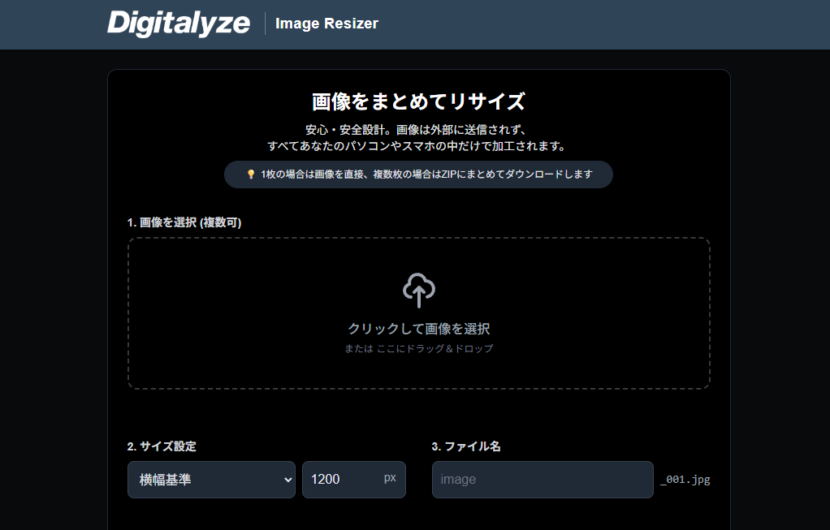 使用者のブラウザ上だけで動作するので、画像がサーバーに保存されたりどこかへ送られたりすることはありません。